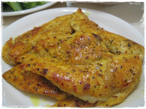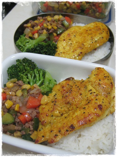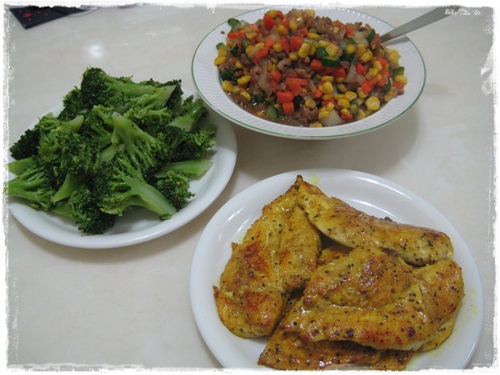 清炒花椰菜、三色蔬菜、嫩煎薑黃雞排